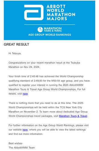 2025年の AbbottWMM MTT Age Group World Championships アボット・ワールドマラソンメジャーズ 年代別世界選手権は、 New York City Marathonにて実施されることになったのですが、 招待状をいただきました! www.worldmarathonmajors.com https://www.nyrr…