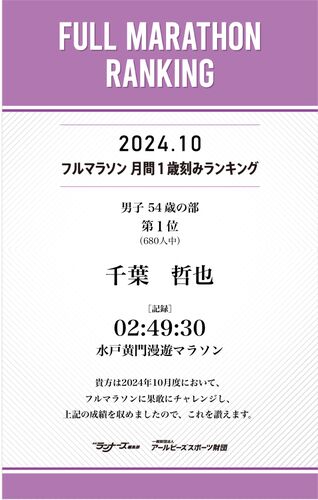 あけましておめでとうございます。 昨年はこのブログを読んでいただきありがとうございました。 本年も引き続きどうぞよろしくお願いいたします。 --- 2024年10月のフルマラソン 月間1歳刻みランキングで 自身初の全国1位を獲得できました!! 2024年10月に…